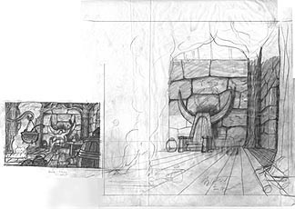 | | Description: Early concept sketch of the interior of Beorn the Berserkers House. This piece was never actually painted.